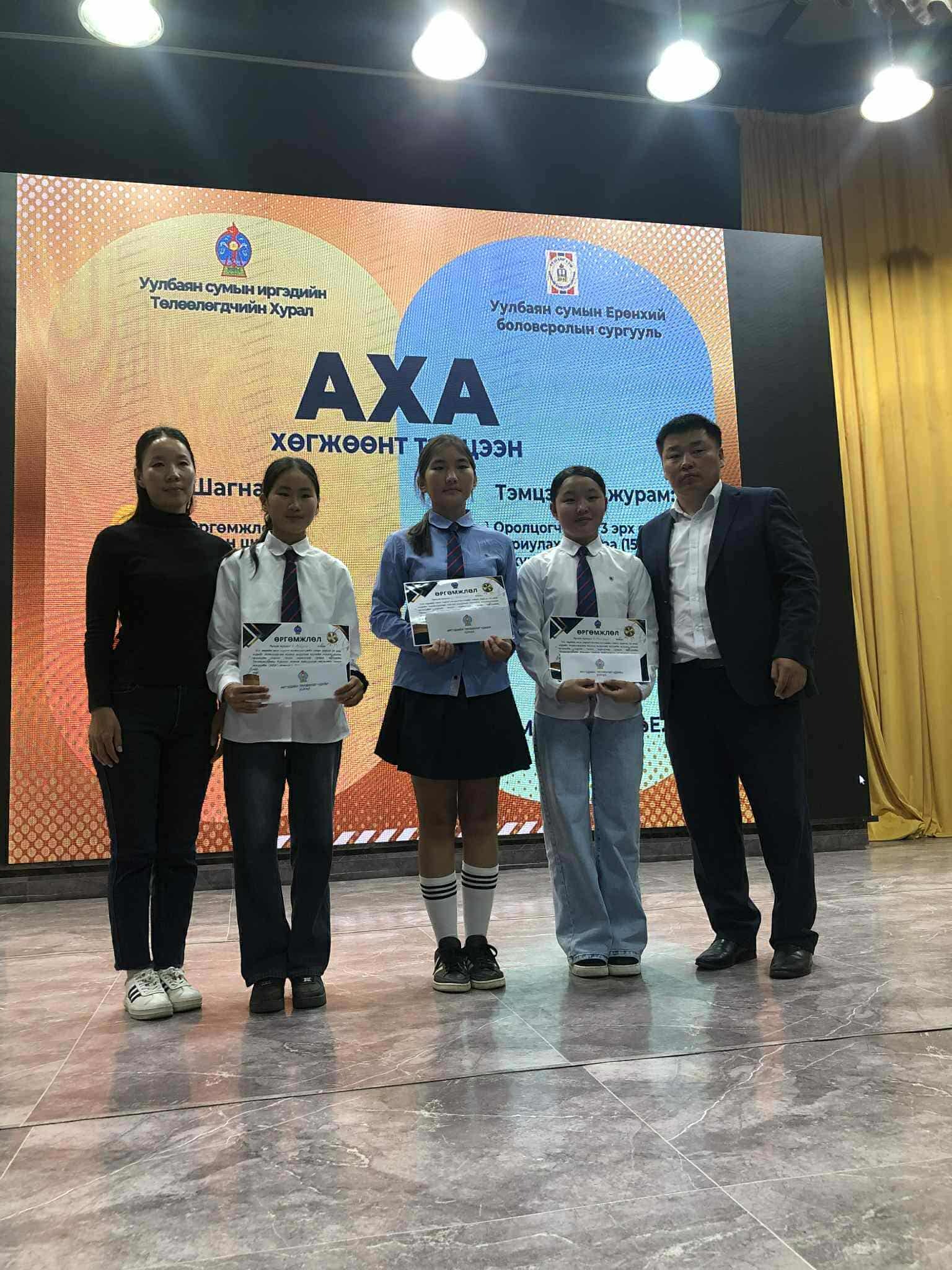 Мөн ИТХ- ын зүгээс хэлмэгдүүлэлт, түүх, өв соёлын талаархи мэдлэгийг нэмэгдүүлэх зорилгоор танин мэдэхүйн "АХА" тэмцээнийг зохион байгуулж дараах сурагчид шагналт байранд орлоо. Үүнд: